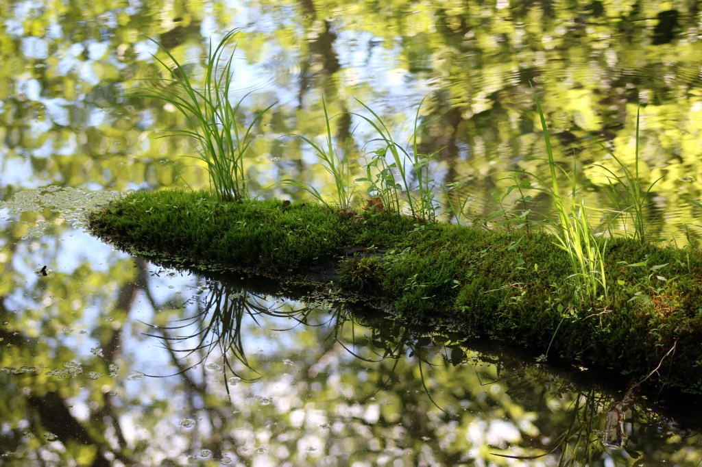 A mossy log in the vernal ponds along the Water Discovery Trail.