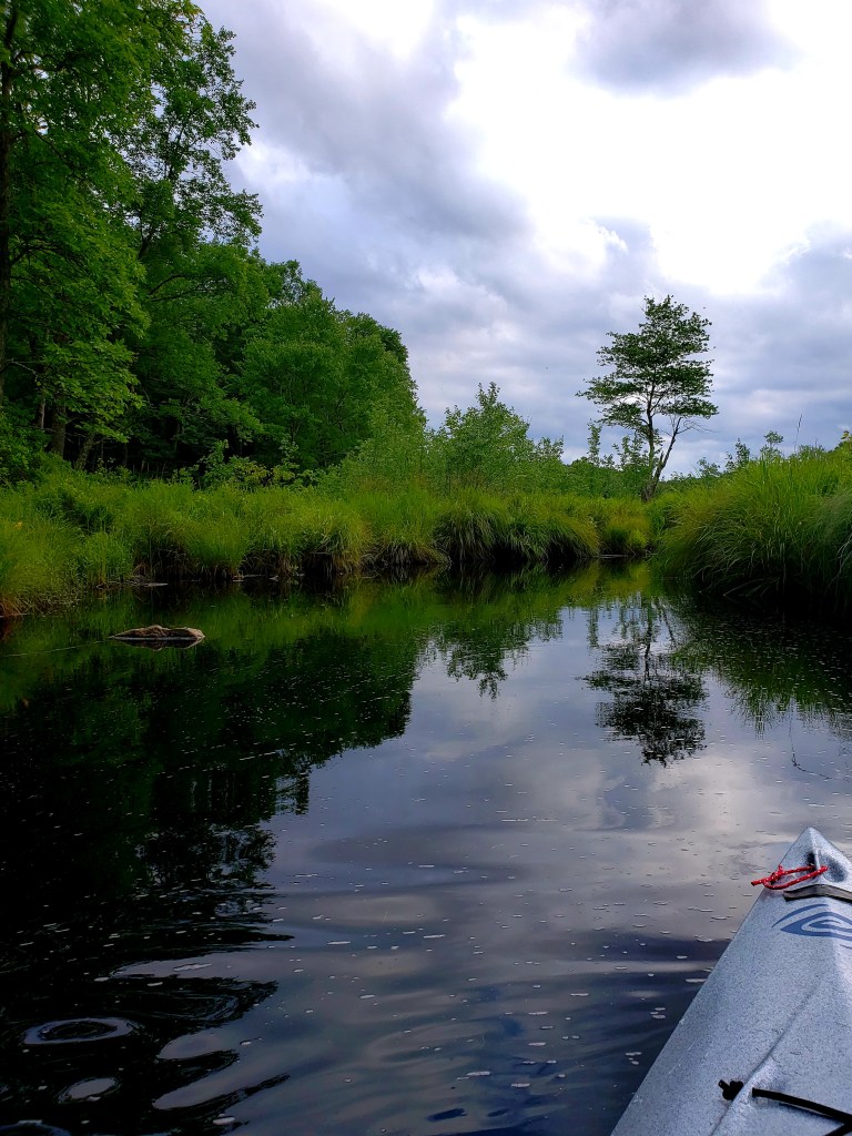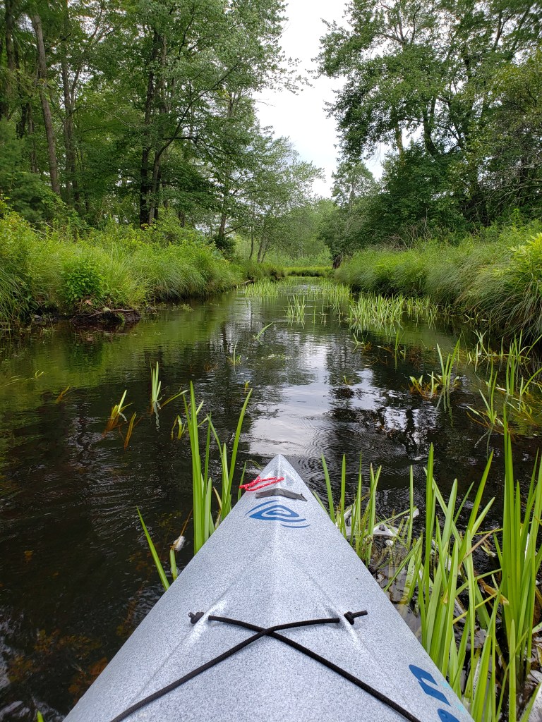 This time, instead of entering at the old cabin spot and working north, due to access issues this time of year as well as lower water near the initial put-in I opted to start at another location. About a mile north the creek passes under Silver Lake Rd near the Bureau of Forestry Edgemere Station. There’s easy parking and a mowed stretch of grass to the water. Getting in was easy. Getting underway however took some effort. My kayak floated, barely. So, the first fifty yards was a combination of pushing and paddling until I managed to get into some water where I could glide. Surprisingly, the depth changed rather rapidly, and the channel opened wide enough to dip on both sides without hitting the marsh grass.